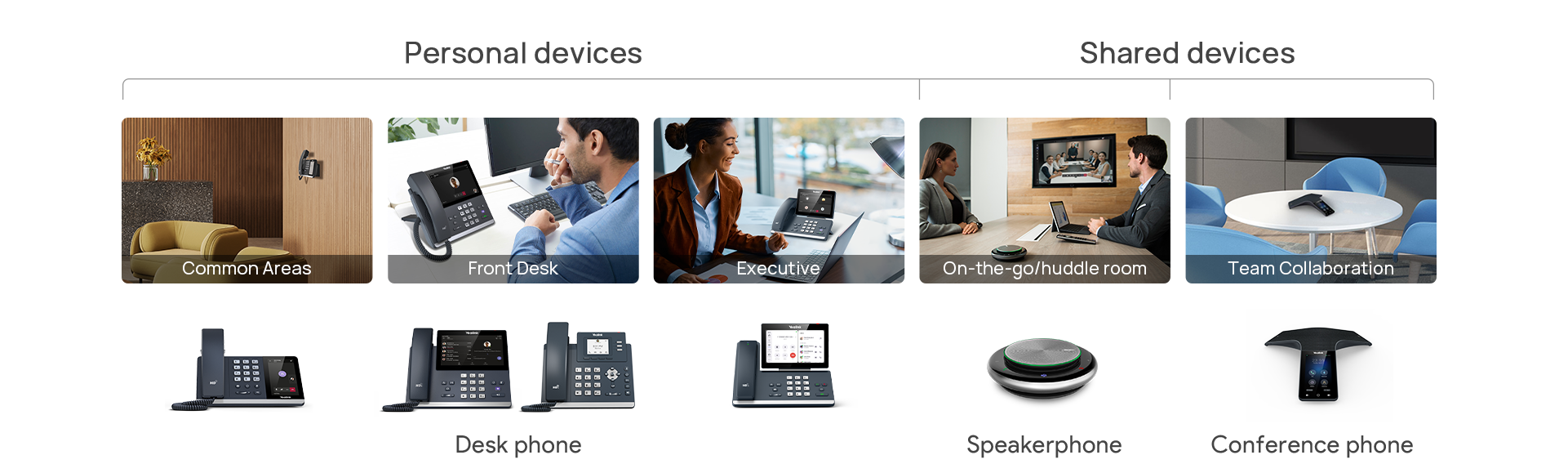 • Audio communication solutions for different scenarios, i.e. common areas, front desks, general office and on-the-go needs, as well as huddle and large rooms.